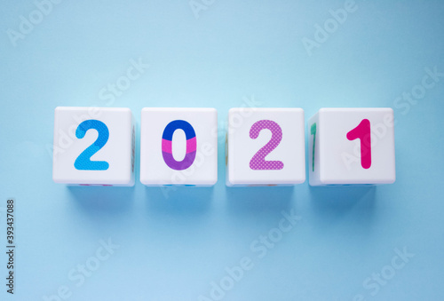Obraz premium Cubes with colorful numbers 2021 on blue background. New year, calendar