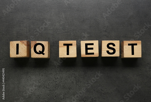 © New Africa, Obraz premium Cubes with text IQ Test on grey background, flat lay