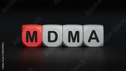 © feng, Obraz premium cubes with the word MDMA. Care concept.close up of wooden elements,Business Concept.3D rendering on black background.