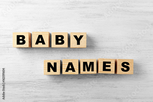 Fototapeta premium Cubes with words BABY NAMES on wooden background