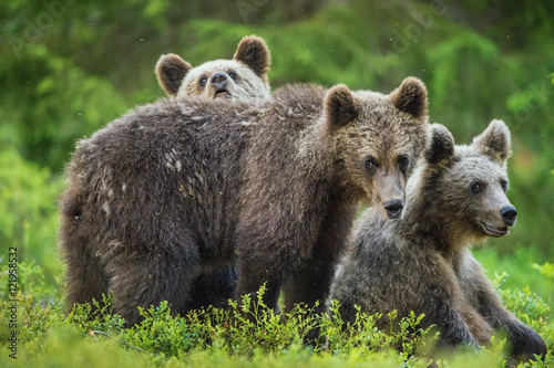 Fototapeta premium Cubs of Brown bear (Ursus Arctos Arctos) in the summer forest. Natural green...