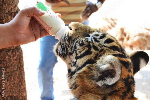 Naklejka premium Cucciolo di Tigre che beve il latte da un biberon di una persona