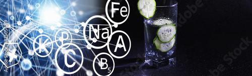 Naklejka premium Cucumber water. Drinking water with fresh cucumber. Mineral water. Healthy, mineral-rich, refreshing water with cucumber.