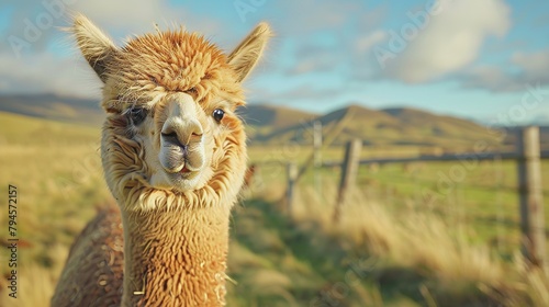 © ArtStage, Obraz premium Cuddly alpaca standing in a pasture AI generated illustration