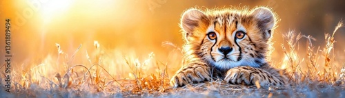 © TEN.POD, Obraz premium Cuddly cheetah cub resting in golden sunlight nature photography wild environment close-up view