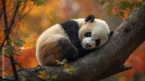 © suja, Obraz premium Cuddly panda cub napping on tree branch