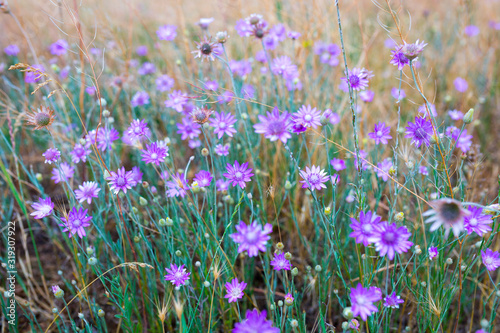 © Sodel Vladyslav, Naklejka premium Cudowne różowo-liliowe kwiaty Xeranthemum annuum to gatunek rośliny znany również jako Annual Everlasting lub Immortelle.