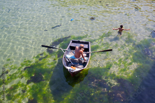 © ABUELO RAMIRO, Fototapeta premium Cuidando de su nieto en una barca.. Asturias. España. Europa
