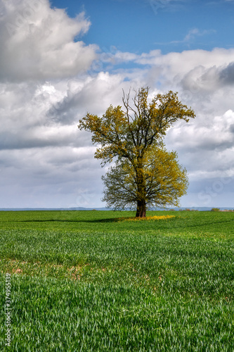 Obraz premium Cultivated fields, lone oak grows on the right, growing grain in the background, Poland, Surroundings of Pasłek, Pomeranian Voivodeship