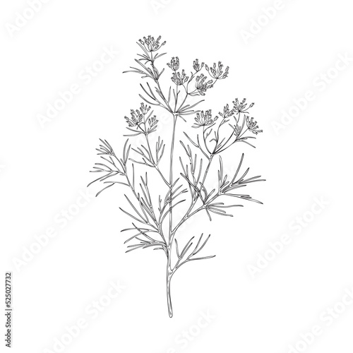 Fototapeta premium Cumin branch botanically detailed black and white vector illustration isolated.