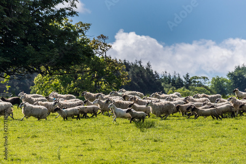 © Klodien, Obraz premium Cumnock, Ayrshire, Scotland, UK - June 18, 2012: Bucolic scene of flock of white sheep running on green pasture backed by darker green trees under blue sky wiht white clouds.