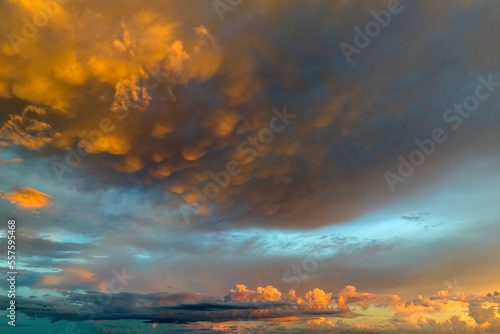 © bilanol, Obraz premium Cumulonimbus clouds forming before thunderstorm on evening sky. Changing stormy cloudscape weather at sunset