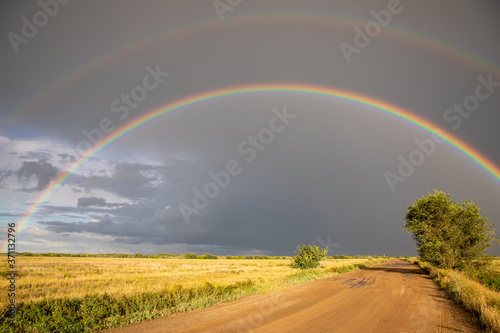 © Kira0Kirina, Naklejka premium Cumulonimbus clouds, torrential rain and double rainbow over the steppe road. Akmola Region, Kazakhstan.
