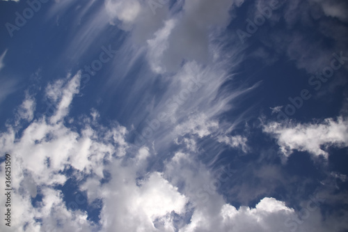 Obraz premium Cumulus and cirrus clouds on a blue sky in sunny weather