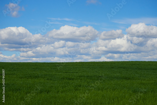 Fototapeta premium Cumulus clouds and field. Horizon and sky with field