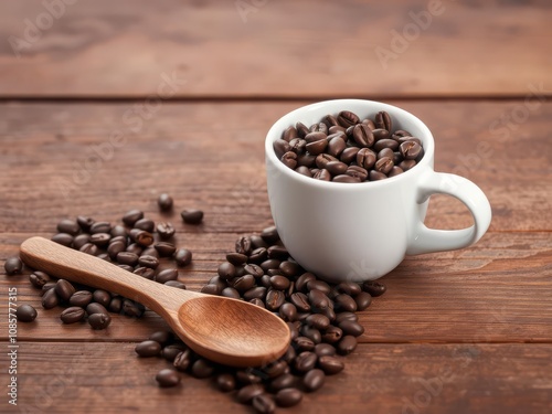 Fototapeta premium Cup filled with coffee beans next to wooden spoon on rustic table, spoon, cup