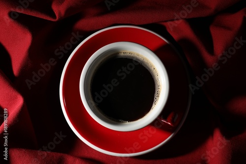 © New Africa, Naklejka premium Cup of aromatic coffee on red fabric, top view