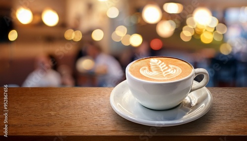 © l1gend, Obraz premium Cup of cappuccino with blur coffee shop background