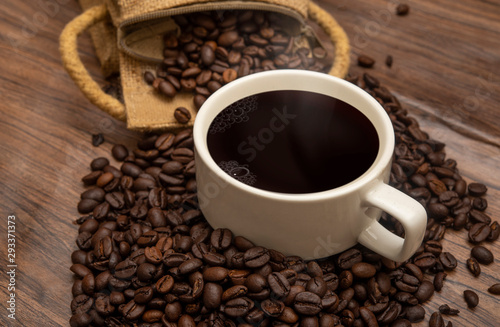 © stockyme, Fototapeta premium Cup of coffee beans and burlap sack on wooden background, copy space banner