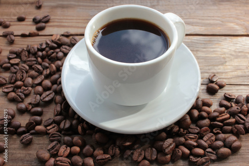 Fototapeta premium Cup of coffee with beans. Black coffee and scattered coffee beans on wooden table