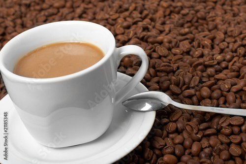 Fototapeta premium Cup with coffee, costing on coffee grain