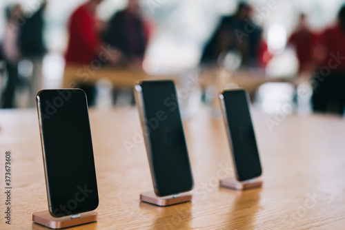 © BullRun, Obraz premium Cupertino , California / USA - November 17, 2018, Apple Park Visitor Center. Modern smartphone with big screen, different models of Iphone, soft focus