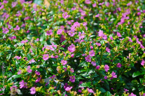 Naklejka premium Cuphea is a compact shrub with small, delicate, lavender or pink star-shaped flowers. The bright green, narrow leaves create a lush backdrop, adding to its ornamental appeal.