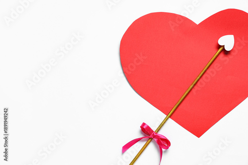 Fototapeta premium Cupid's arrow and red paper heart on light background. Valentine's Day celebration