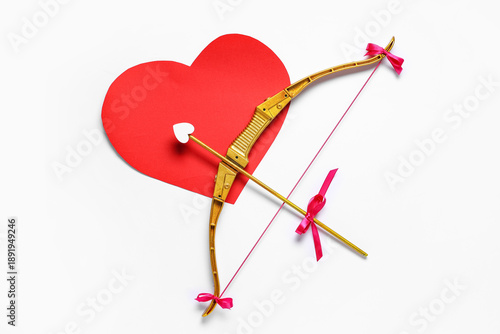 Fototapeta premium Cupid's bow and red paper heart on light background. Valentine's Day celebration