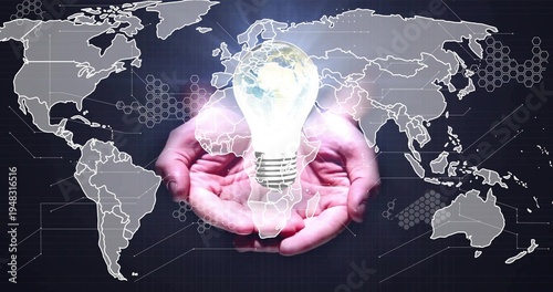 © vectorfusionart, Fototapeta premium Cupping bare hands holding glowing bulb with miniature Earth over dark gridded network map backdrop