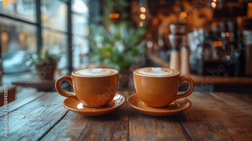 © Cristina, Obraz premium cups of coffee cappuccino with latte art on the table
