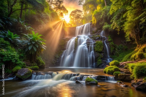 © Arethaawykoff, Obraz premium Cuquenan Falls in June peaceful, serene image of the falls at dusk, with soft, warm light, and a sense of calmness and relaxation, with accurate depiction of the rainforest's sounds and scents.