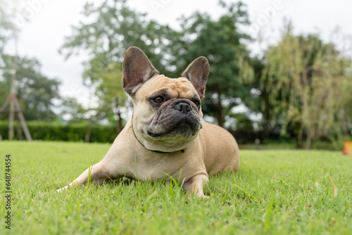 © tienuskin, Obraz premium Curiosity French bulldog lying on grass field looking away.