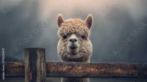 © ProVector, Naklejka premium Curious alpaca looking over wooden farm fence