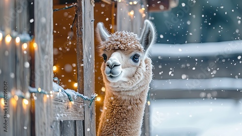 © Makhbuba, Naklejka premium curious alpaca peeking from snowy stable decorated with lights .