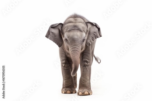 © Sunny_Hare, Fototapeta premium Curious baby elephant walking toward camera, white studio background.