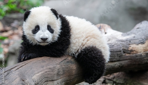 © Igor, Fototapeta premium Curious Baby Giant Panda Resting on a Log