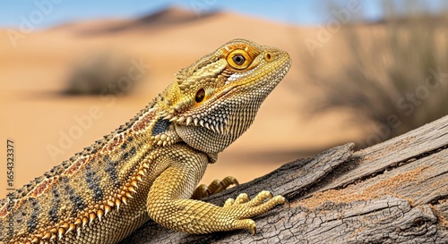 © Mobiles, Fototapeta premium Curious Bearded Dragon Portrait on Desert Log with Studio Lighting
