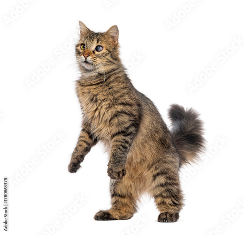 © Eric Isselée, Naklejka premium Curious blind in one eye cat standing on hind legs, raising front paws and looking up