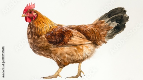 © YauheniB, Fototapeta premium Curious brown chicken on white background