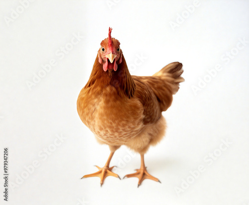 © CheeSiong, Fototapeta premium Curious brown hen standing on white background