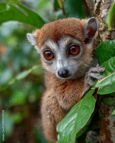Fototapeta premium Curious brown lemur gripping tree branch with wide expressive eyes in tropical forest habitat