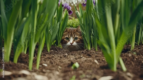 © OAKZTER, Obraz premium Curious cat among iris flowers