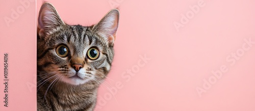 © Muhas, Obraz premium Curious Cat Peeking From Behind a Pink Wall