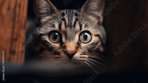 © Egriva, Fototapeta premium Curious Cat Peeking from Behind a Wooden Surface