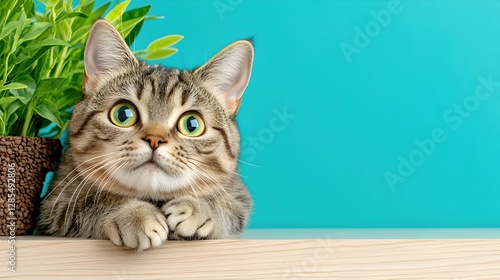 © Teerapat, Naklejka premium Curious Cat with Bright Green Eyes Peeking Over a Wooden Surface