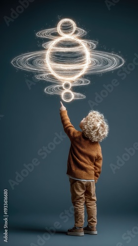 © kvladimirv, Fototapeta premium Curious Child Touching Glowing Planetary Orbit Illustration