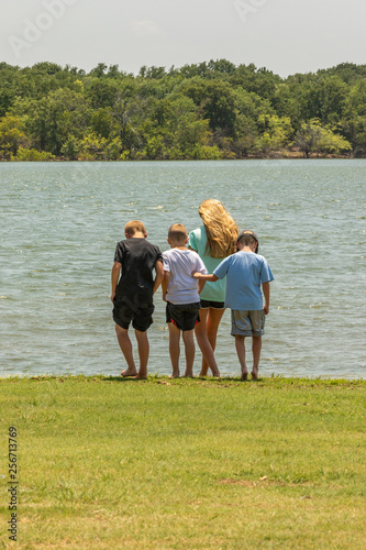 © Debra Lawrence, Obraz premium curious children standing next to the water at a lake