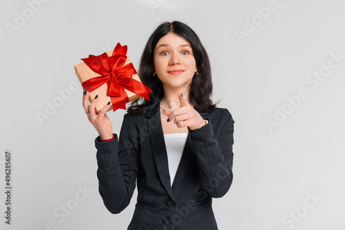 © Red Cristal, Fototapeta premium Curious cute brunette teenager girl in black blazer celebrating birthday, wonder whats inside b-day gift, shaking box and smiling happy, white background. Holidays, celebration and birthday concept