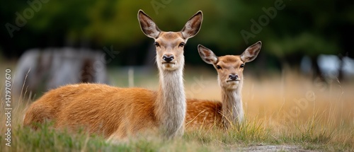 © Humairaa_Std, Obraz premium Curious deer pair gaze from meadow